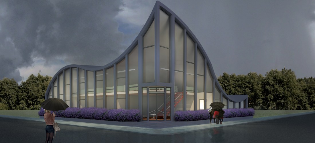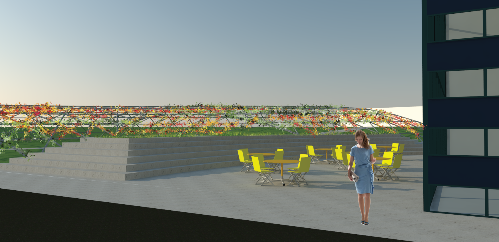 The Voronoi Diagram is used for this design. I was looking for a way to make the appearance of the Foodlab a surprise. The solution for this is was on the terrain all along. I had a lot of soil left when excavating for the parking-lots and (bicycle-)paths. I placed this in front of the Foodlab to create even more of a surprise. For the building I used the same voronoi diagram with the help of Voronax. It creates the optimal geometry between points trough the same proces as bubbles when they are forming.